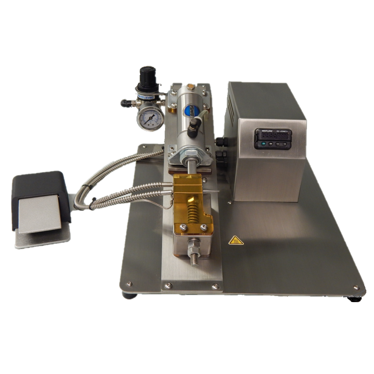 The AMT-210 provides a means of expanding hard plastic tubing to allow insertion of fittings and other components. This works better than a heated mandrel because of the range and the addition of a controlled stretching action. Standard straight or tapered jaws sizes are available in addition to custom jaw sets. The jaws are independently heated and warm quickly to soften tubing materials such as PE, HDPE, UHMW and PTFE. As the tubing cools it shrinks back to the original size, after the fitting is inserted. Send us your samples, we'll set it up before shipping.