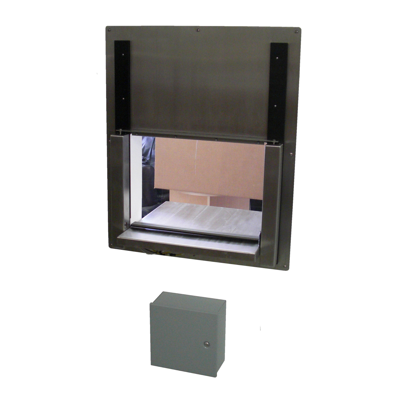 The AMT-320 is a pass through window that is fully automatic. The window utilizes optical sensors to open. The sensors are located on both the inside and outside of the window, while blocked they keep the window open thus providing a safety circuit. The pressures required to open and close the window are extremely low, resulting in a completely safe automated device.